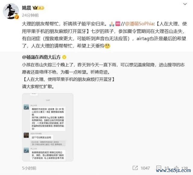 8 月 12 日,演员姚晨转发相干微博为其发声求援:大理的一又友帮赞理,祷告孩子能祥瑞回来。